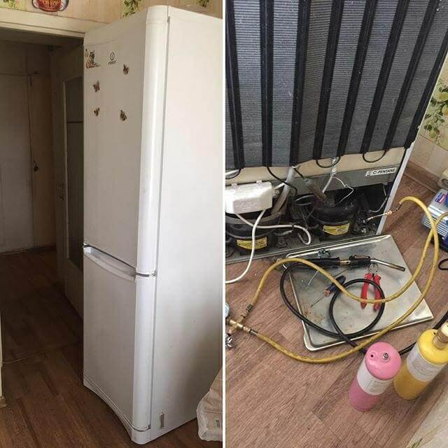 - Повышенная температура в камерах и скопление льда, свидетельствуют об утечке хладагента. При этом задняя крышка вздувается и компрессор, пытаясь стабилизировать температуру, работает в постоянном режиме. Понадобится заправка фреона, и ремонт поврежденных частей корпуса. Цена услуги от 10 000 тенге.